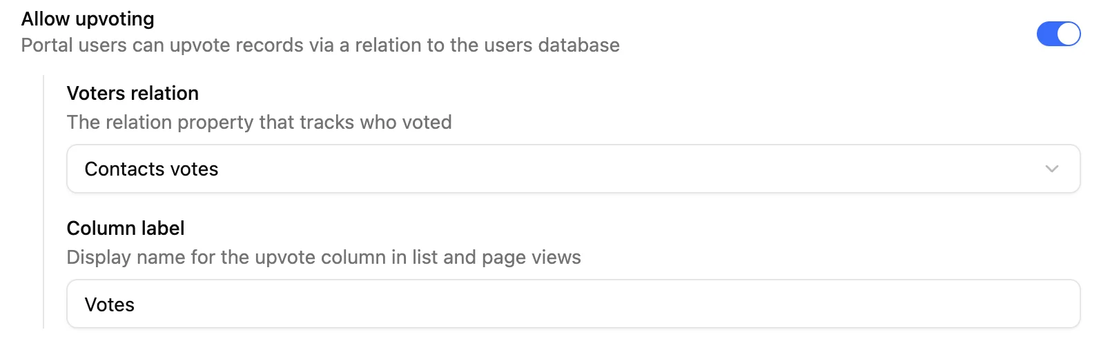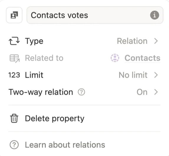Le vote repose sur une propriété de type relation dans Notion qui lie votre source de données à votre base de données d’utilisateurs.