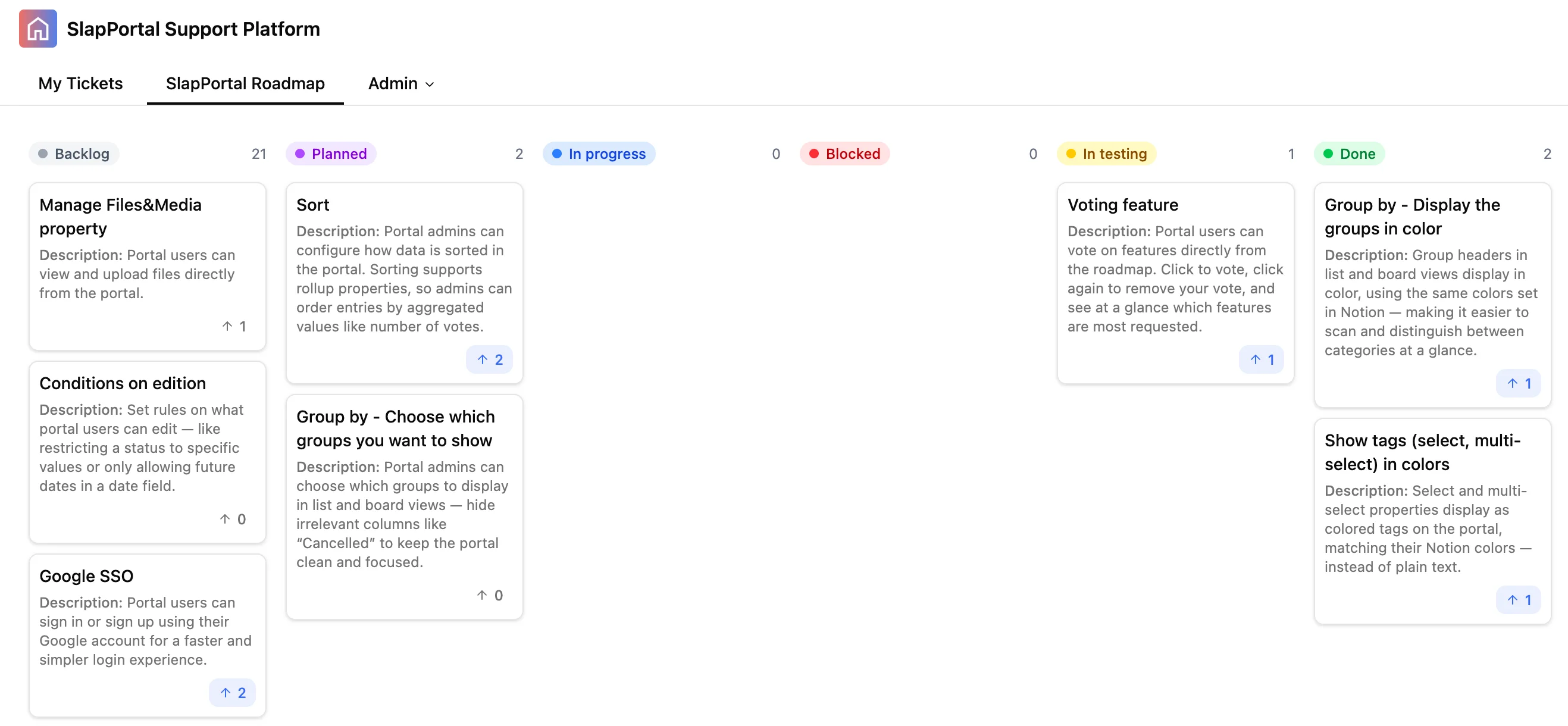 Les utilisateurs du portail peuvent voter sur des pages directement depuis votre portail. Cliquez pour voter, cliquez à nouveau pour retirer votre vote, et voyez en un coup d’œil quels éléments sont les plus demandés.